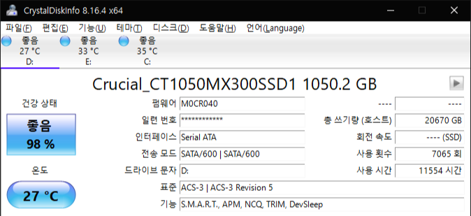 CrystalDiskInfo(크리스탈디스크인포)로 확인해보니, ssd처럼 건강상태 퍼센트는 나오지 않네요.