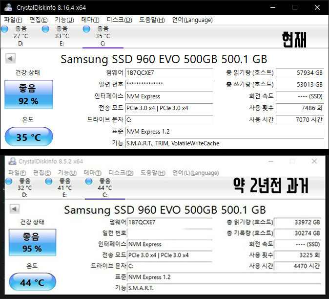 '삼성 M.2 4년 6개월째, SSD 5년째, HDD 4년 6개월째' 사용중입니다. 컴퓨터 매일 약 6시간씩은 사용합니다.