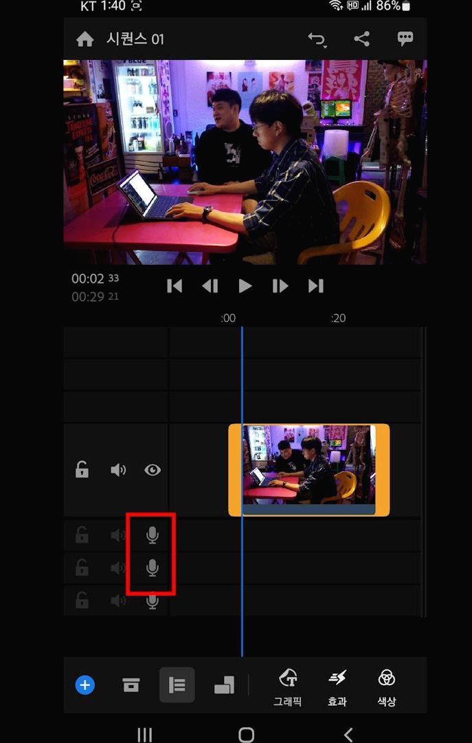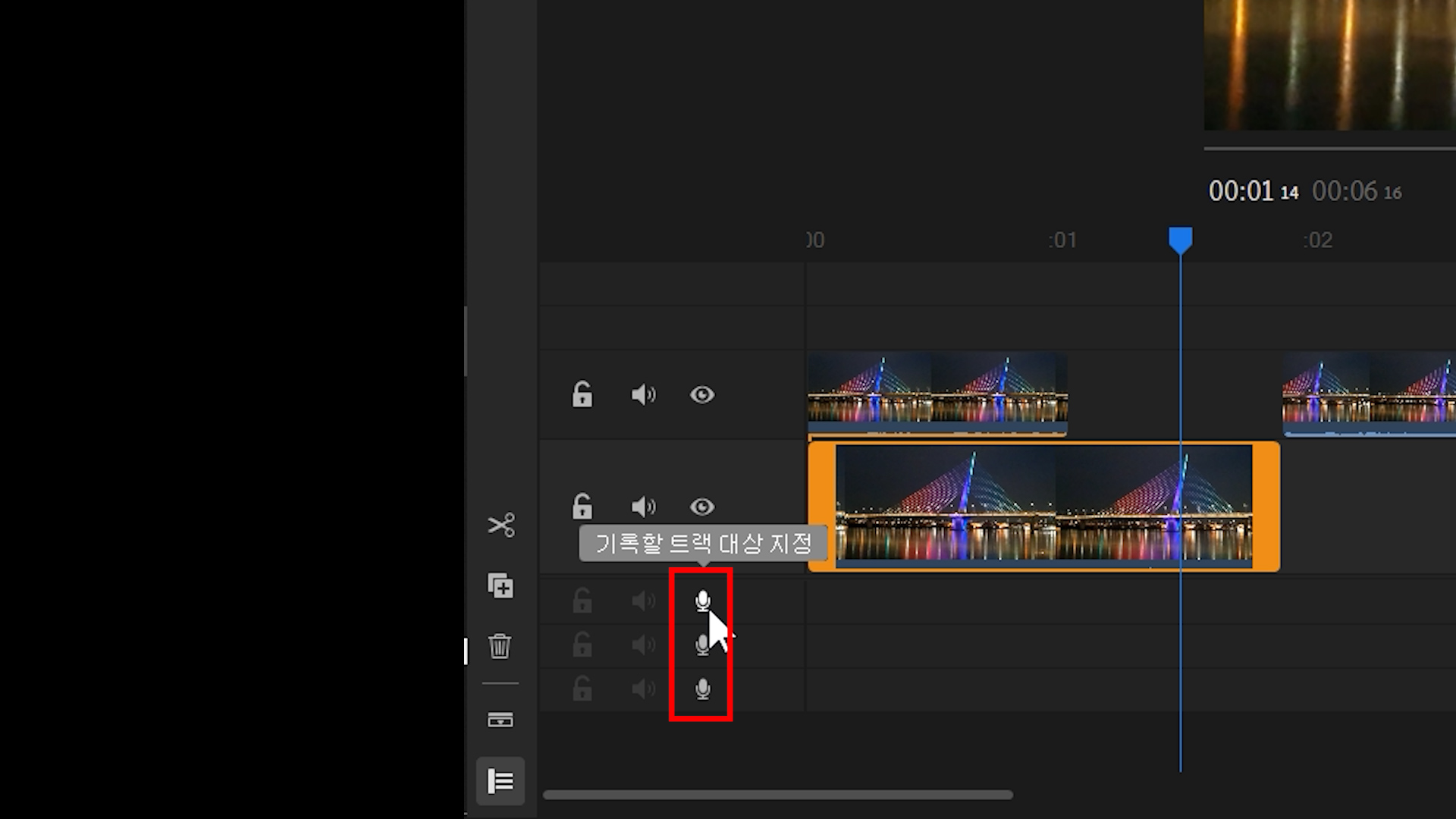 여기서 녹음하고 싶으면 오디오 트랙에서 마이크 버튼을 클릭하면 녹음이 됩니다.