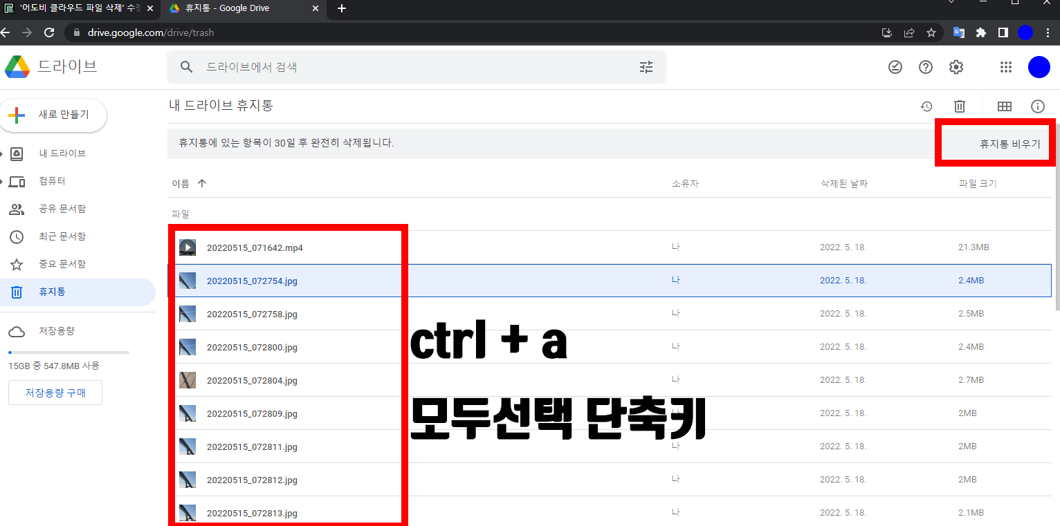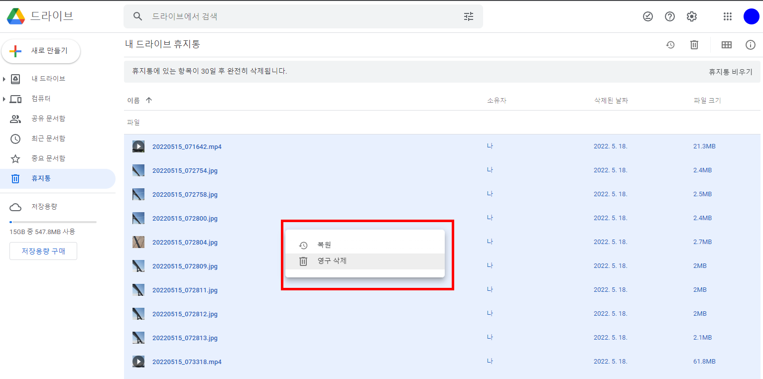 비교를 위해서 일반적인 구글 드라이브 휴지통 모습을 가져왔어요.