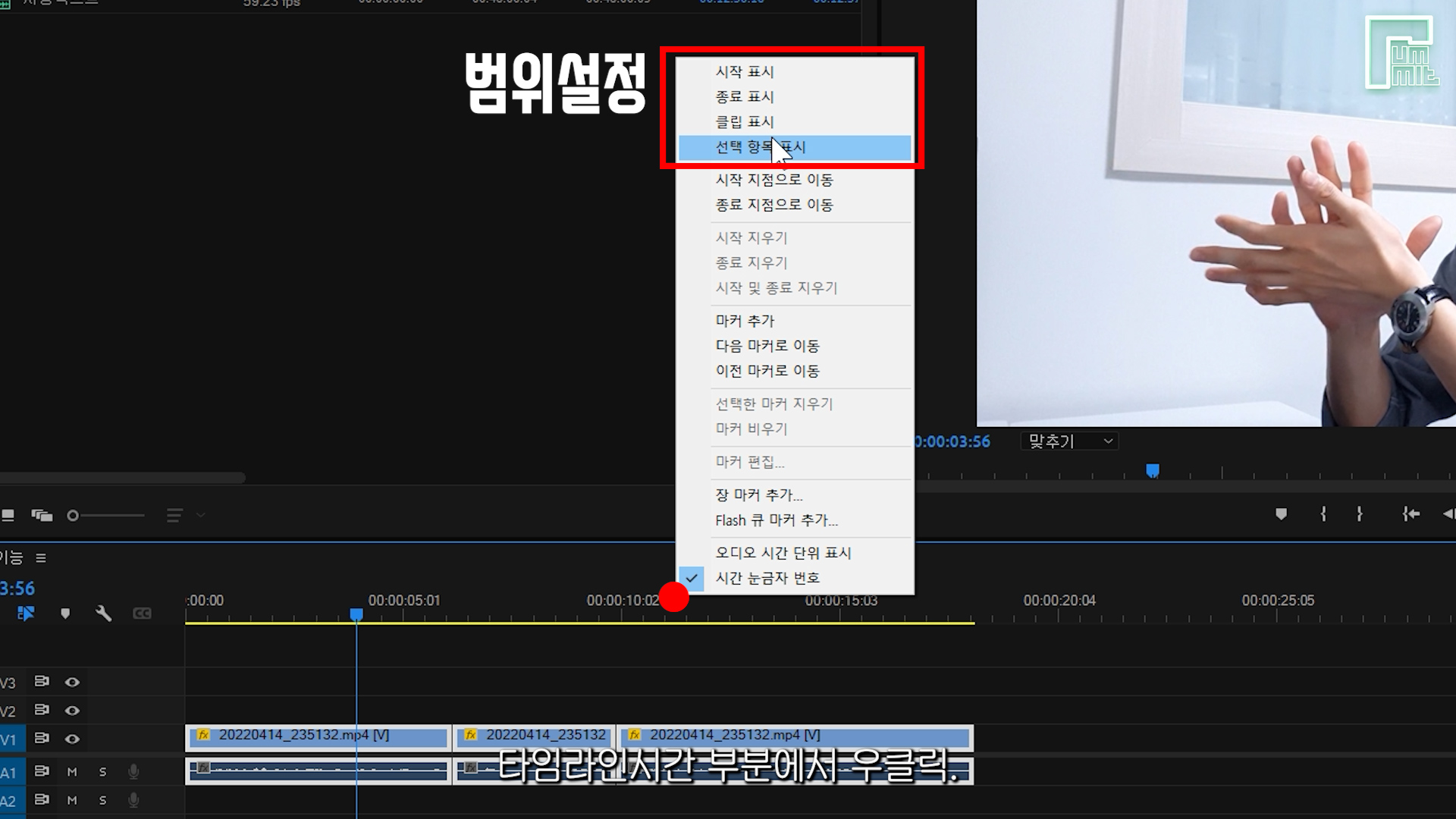 자막을 만들 범위 설정해줍니다. 타임라인 시간 부분에서 우클릭.