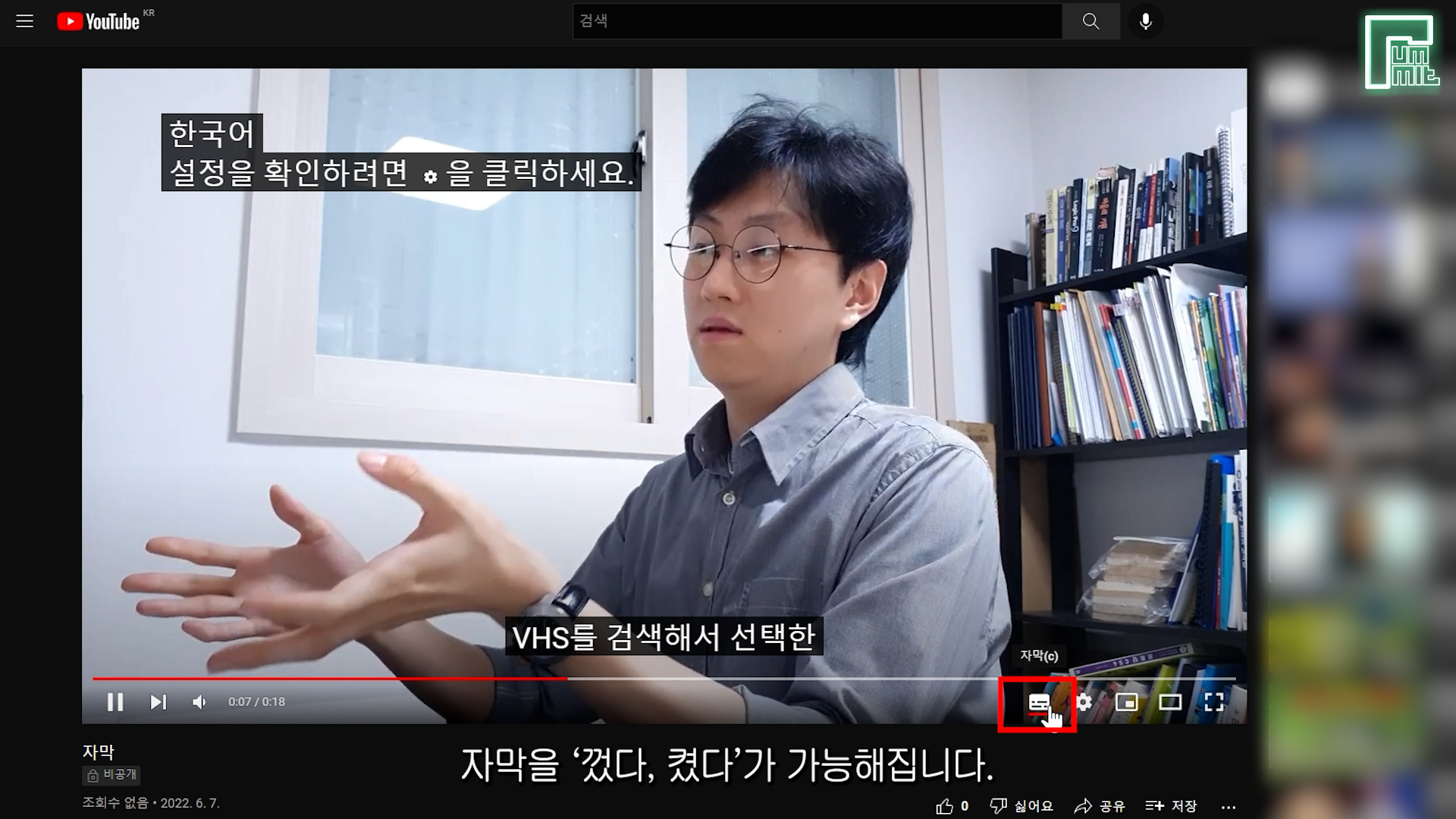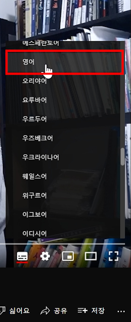 유튜브에서 캡션 자막이 영어로 잘 나오는지 확인을 해봅시다.