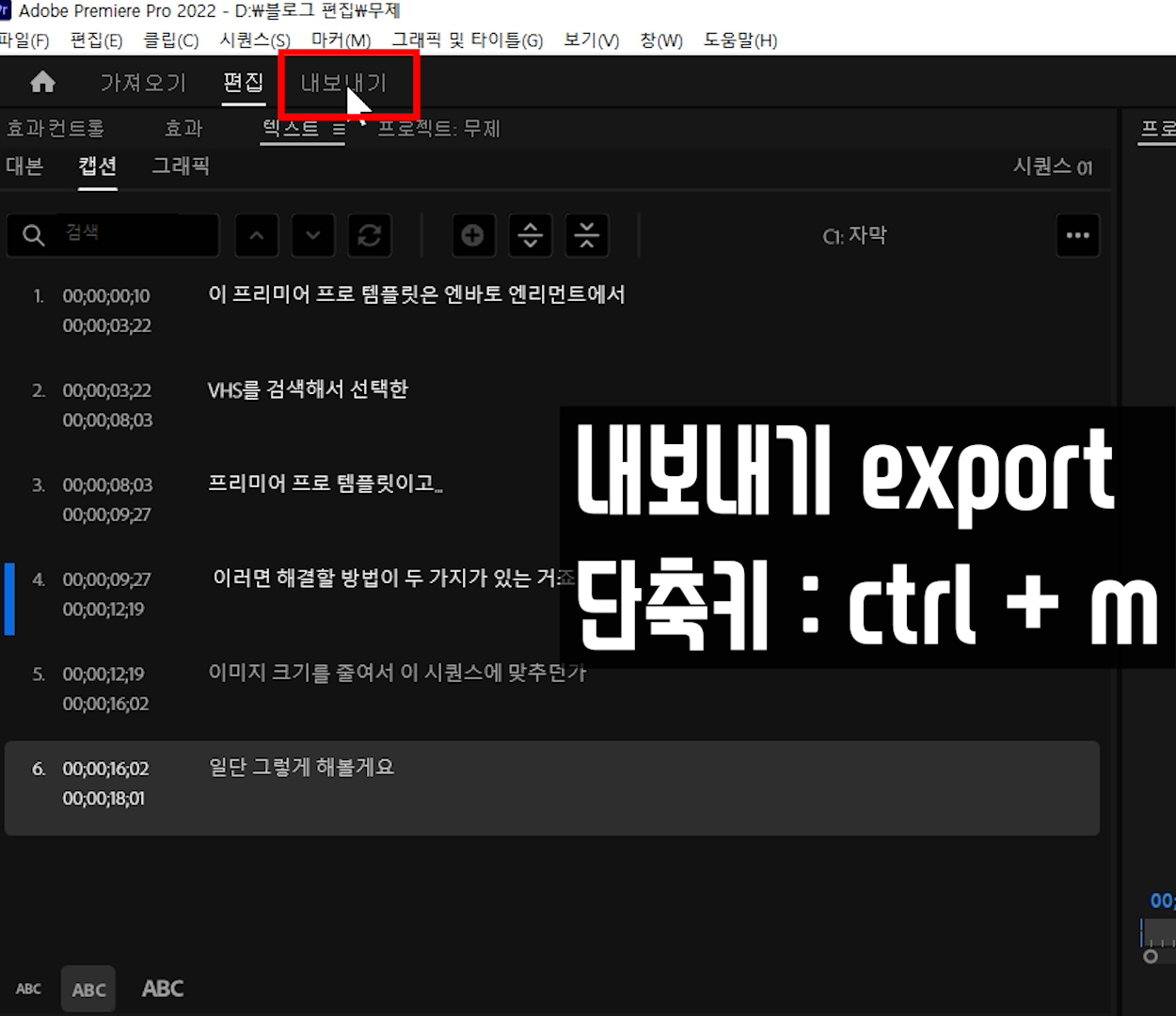 편집과 자막이 완성되면 내보내기(출력,export,단축키: ctrl+m) 설정을 확인합니다.