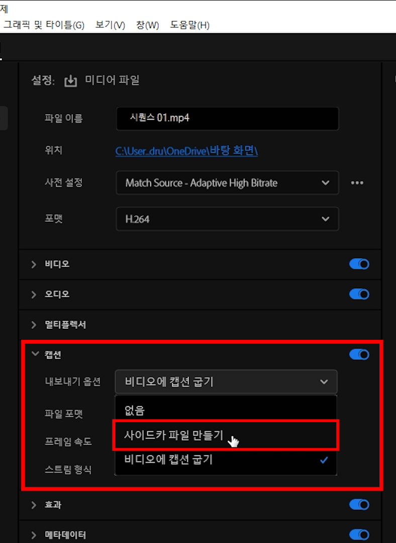 내보내기 설정 - 캡션 - '사이드카 파일만들기'.