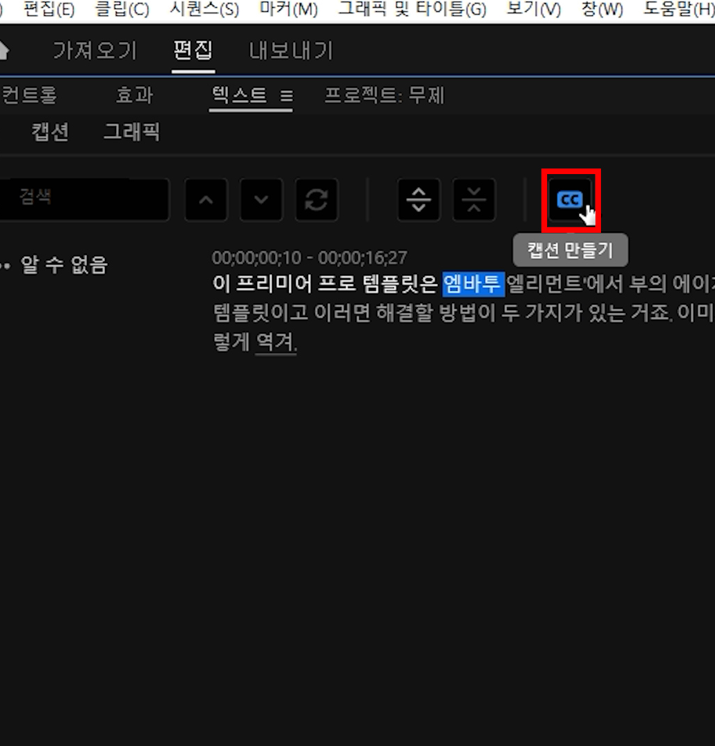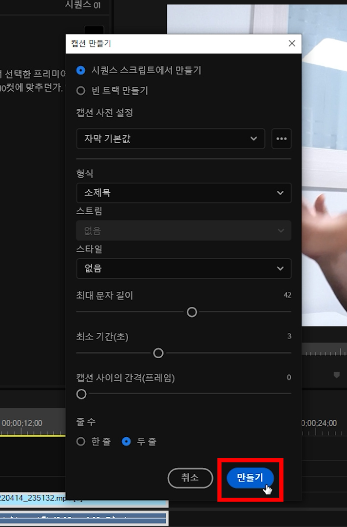 텍스트 패널 위쪽에 cc버튼(캡션 만들기)을 누르면 '캡션 만들기' 설정 창이 나옵니다.