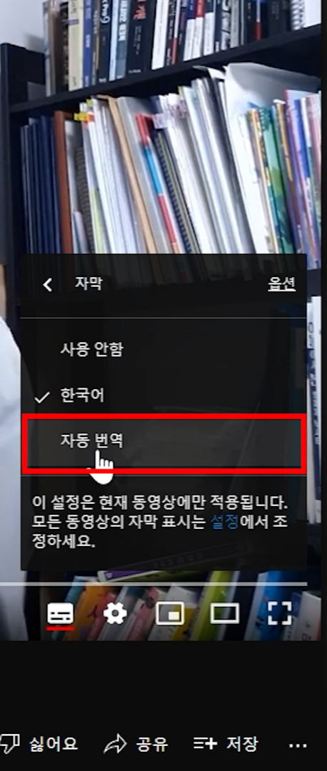 설정(톱니바퀴 모양) - 자막 - 자동번역 - 영어