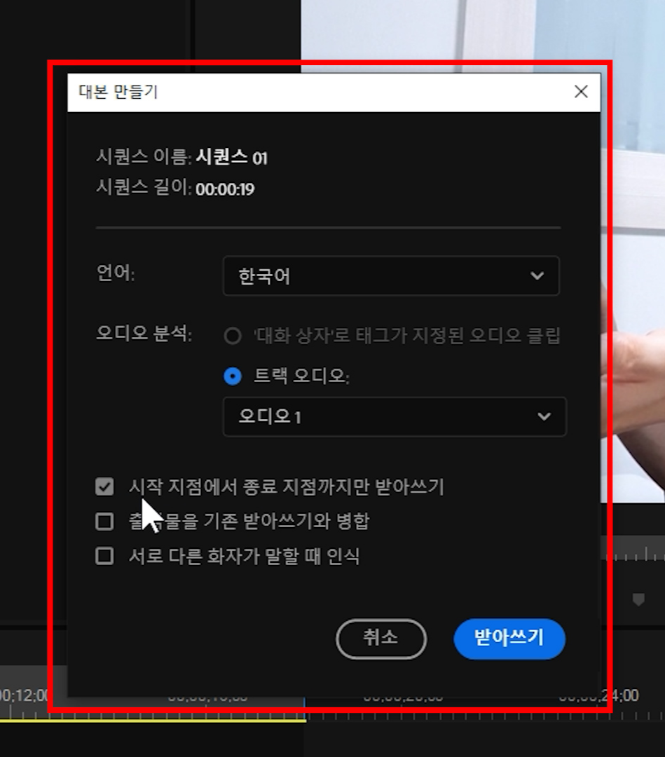 그리고 범위를 성정해 뒀기 때문에 '시작 지점에서 종료 지점까지만 받아쓰기'를 선택합니다. 편집이 복잡해지면, 이 기능이 유용합니다.
