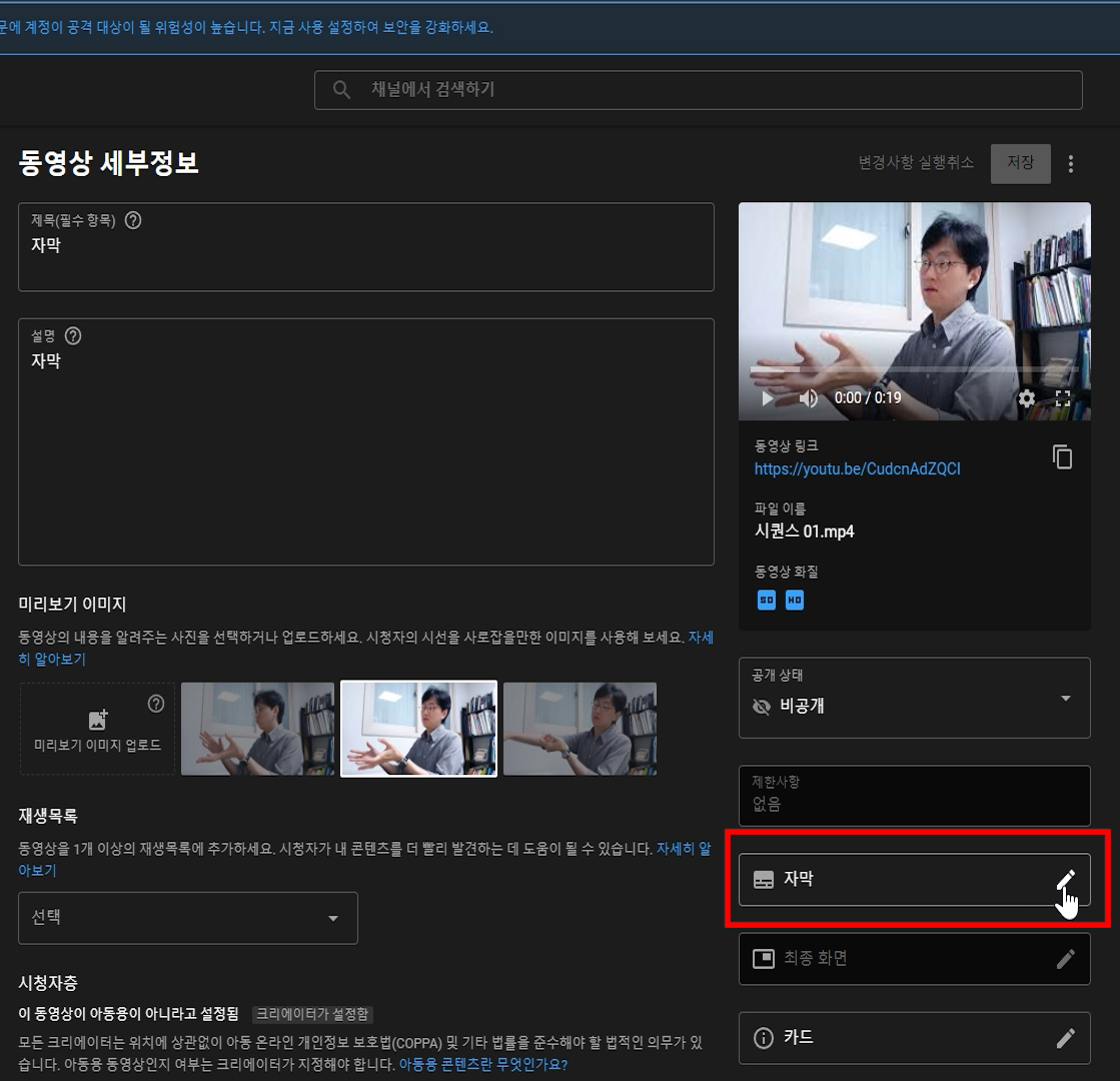 저는 영상과 자막을 따로 출력해서 유튜브에 업로드 합니다.
