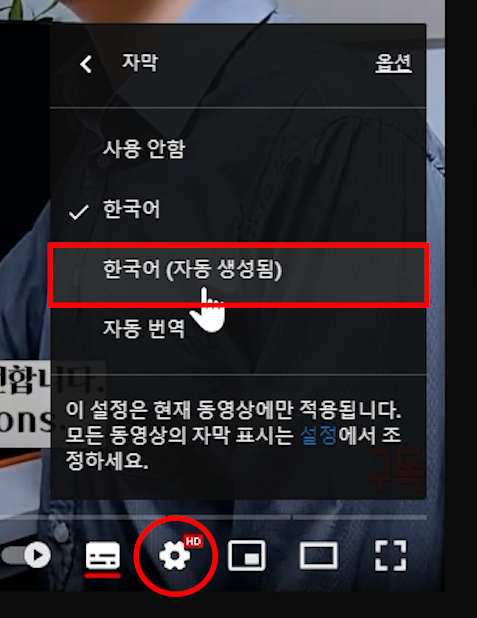 이제 영상을 확인해 보면 자동 생성된 한국어 자막이 없어요.