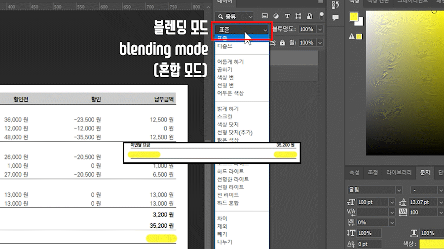 포토샵, 형광펜, 효과, 블렌딩, 모드, 혼합, 꿀팁, 불투명도, 글자, 선명도, 한국, 어도비, 강의, Photoshop, highlighter, effect, blending, mode, blending, hack, opacity, text, sharpness, Korea, Adobe, lecture, 블랜드, blend.
