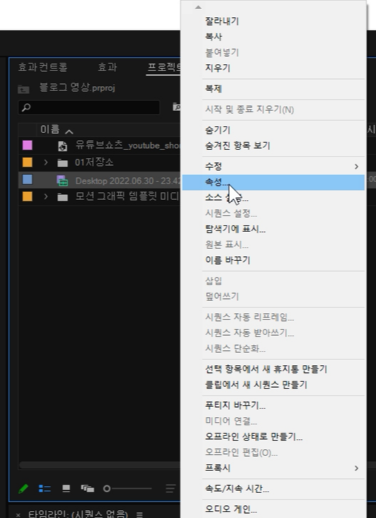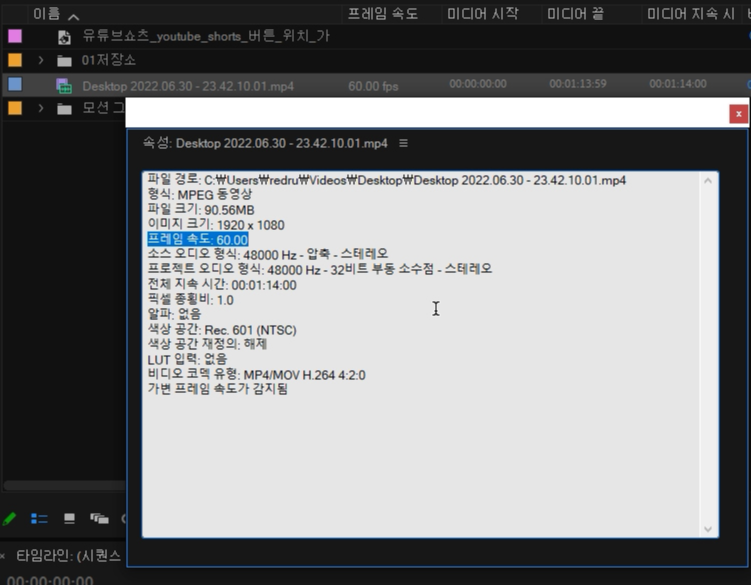 어도비 프리미어 : 영상 우클릭 - 속성 - 프레임 속도 확인.