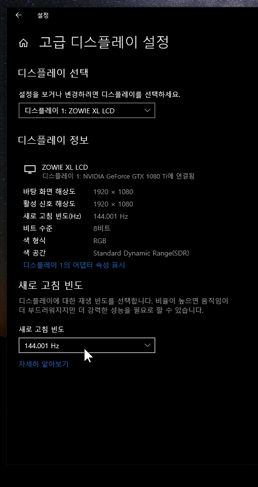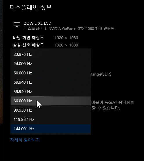 고급 디스플레이 설정 - 새로 고침 빈도.