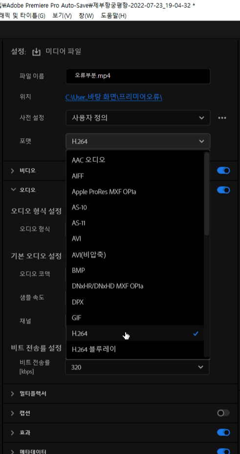 그래서 해당 영상파일(오디오파일)의 파일 경로 위치를 변경해보고, 코덱도 다양하게 사용했어요.