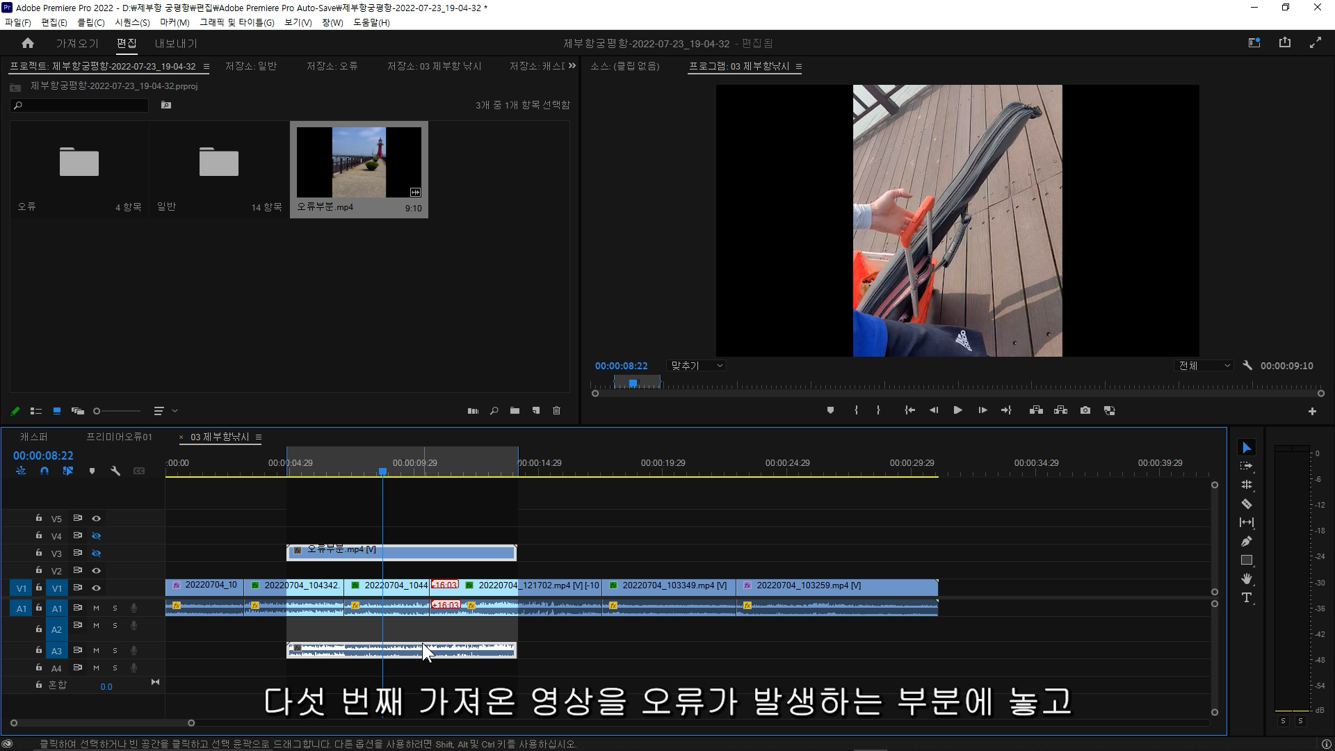 05. 가져온 영상을 오류가 발생하는 부분에 놓고, 오류가 발생하는 클립(비디오 또는 오디오)을 대체하여 사용합니다.