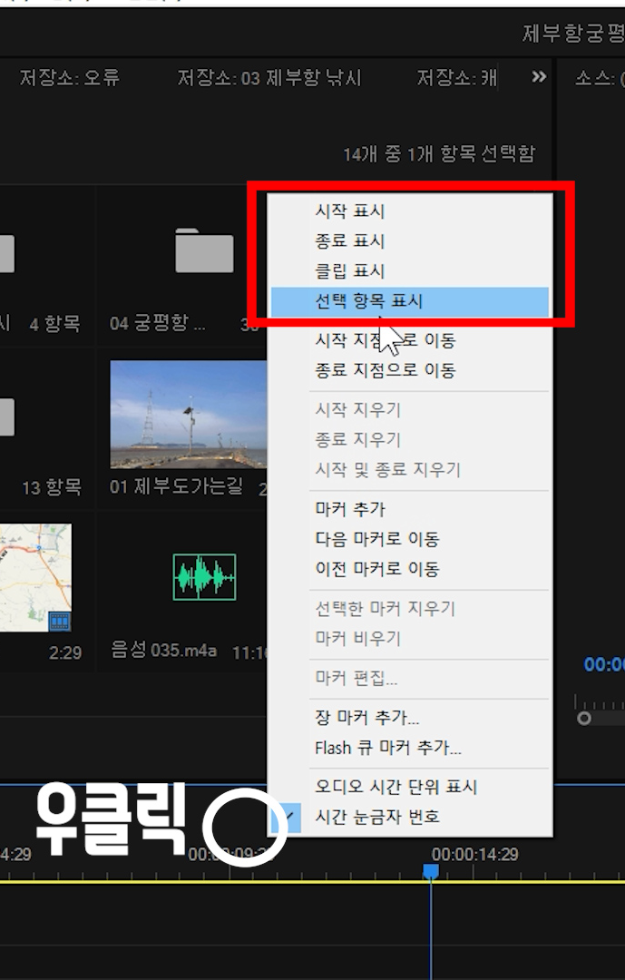 타임라인 윗 부분에서 우클릭 '선택 항목 표시'.
