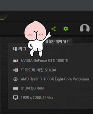 '엔비디아 지포스 익스피리언스(NVIDIA GeForce Experience)'를 실행하고, 구석에 삼각형을 클릭하면 '게임 내 오버래이 열기'가 실행됩니다.