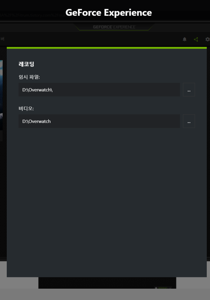 지포스 익스피리언스 녹화 경로 변경 방법 : 게임 내 오버레이열기(alt+z) - 설정(톱니바퀴) - 레코딩 - 경로 변경.