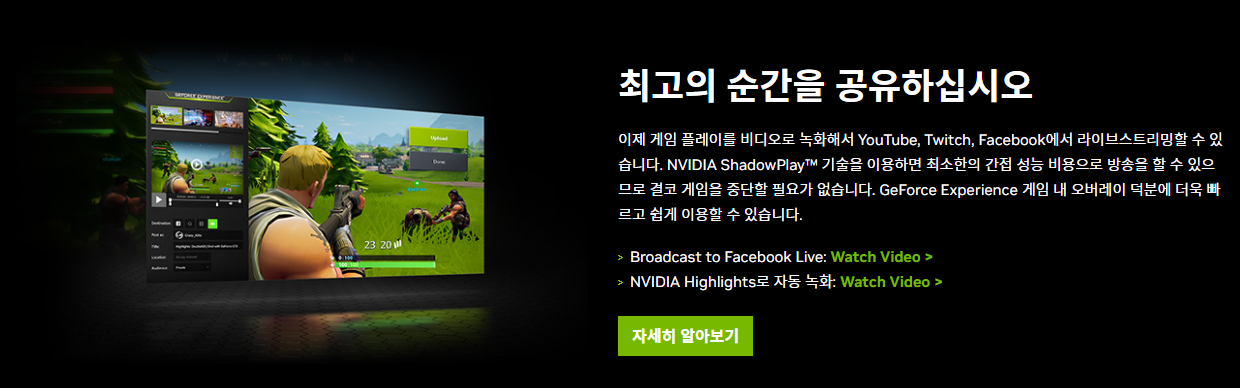 비디오, 스크린샷, 라이브 스트림을 캡처하여 친구와 공유하십시오. 드라이브는 최신 상태로 유지하고 게임 설정을 최적화하십시오. GeForce Experience를 이용하면 이 모든 것을 할 수 있기에 GeForce Experience는 GeForce 그래픽 카드의 필수적인 동반자입니다.