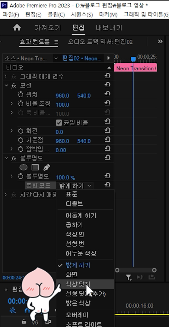 그리고 '효과 컨트롤 패널 - 불투명도 - 혼합 모드'에서 선택했습니다.