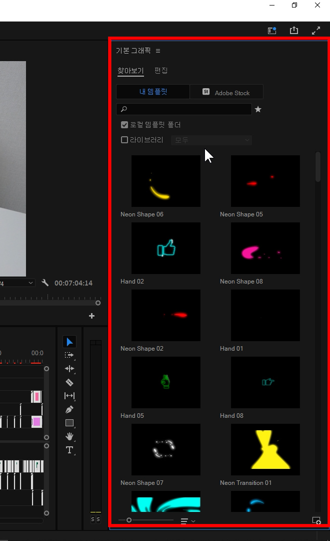 마음에 드는 모션 그래픽 Motion Graphics Template(.mogrt) 파일을 잡고 끌어서 프리미어 기본 그래픽으로 옮깁니다.