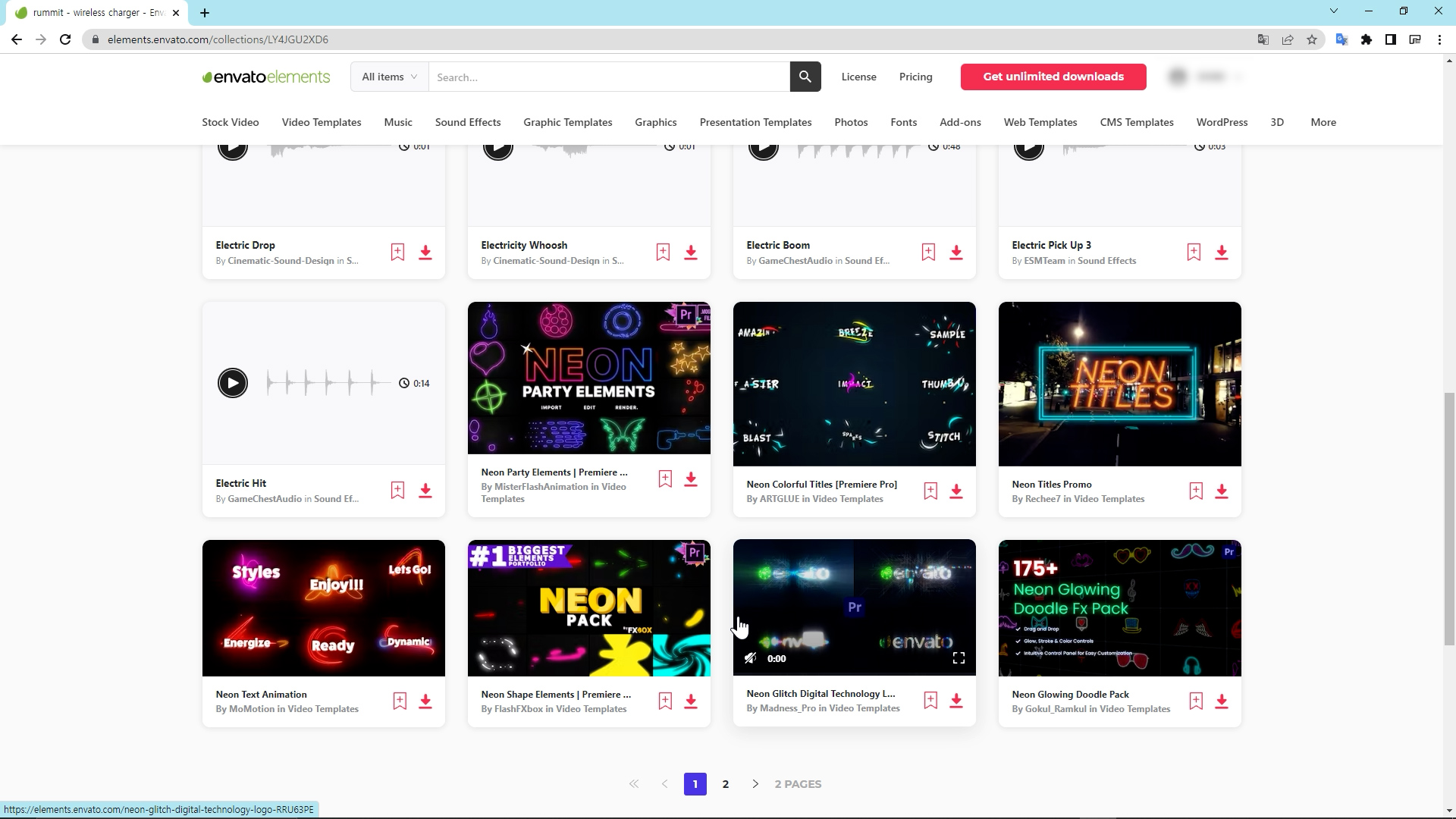 이제 '효과음(Sound Effects)' 페이지에서 Electric을 검색했습니다.