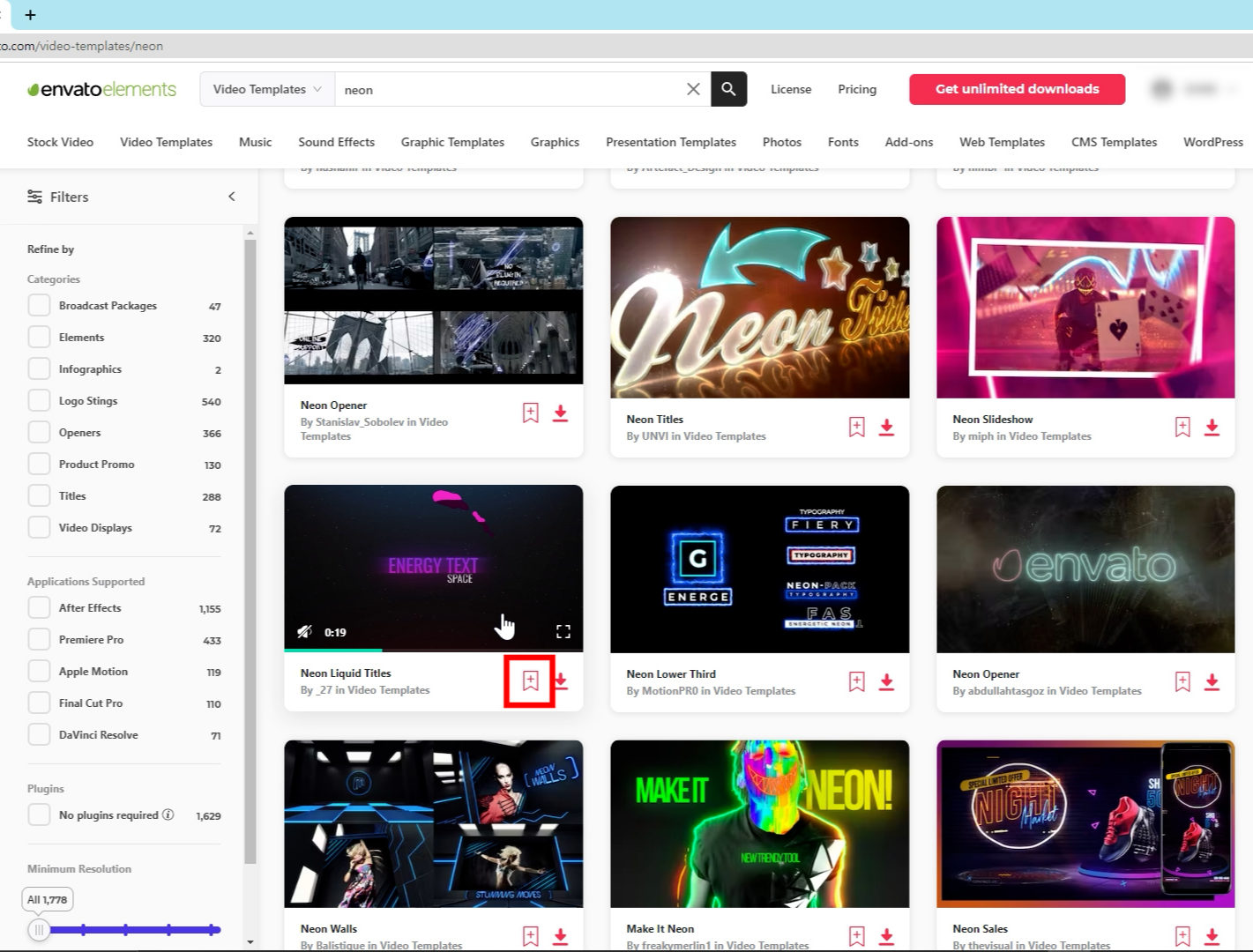 비디오 템플릿(Video Templates) 페이지에서 '네온(neon)'을 검색했습니다.