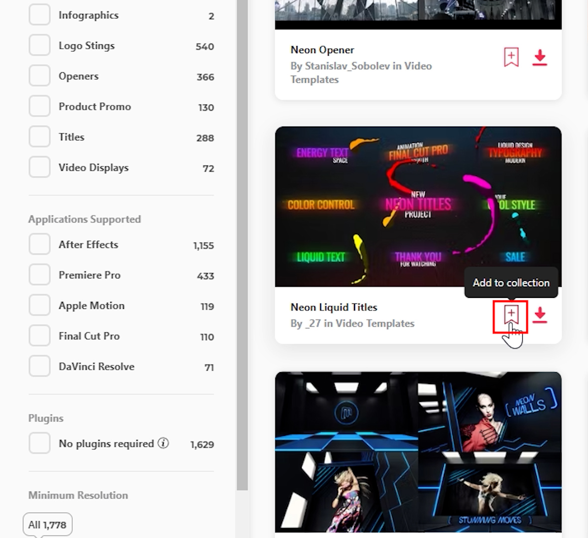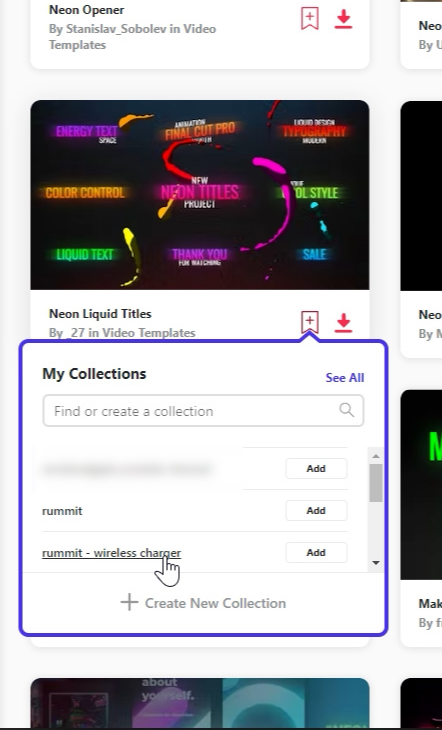 다양한 네온 효과들 중에 마음에 드는 것의 '+(add to collection 버튼)'를 눌러서 한 페이지(폴더 개념)에 모아뒀습니다.