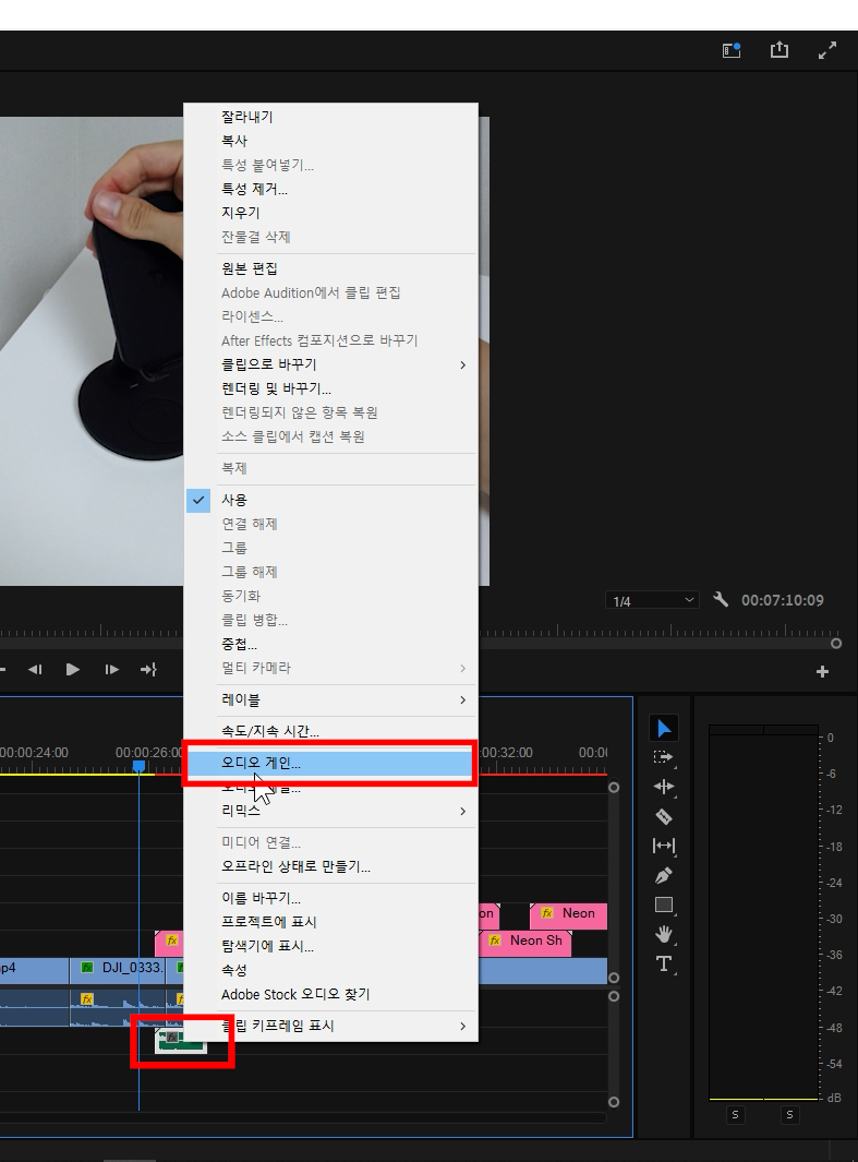 그리고 효과음 소리가 너무 크니깐, 사운드 클립에서 '우클릭- 오디오 게인'을 누릅니다.