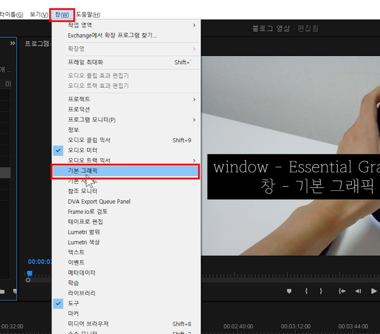 프리미어 상단 메뉴에서 '창 - 기본 그래픽'을 누릅니다.