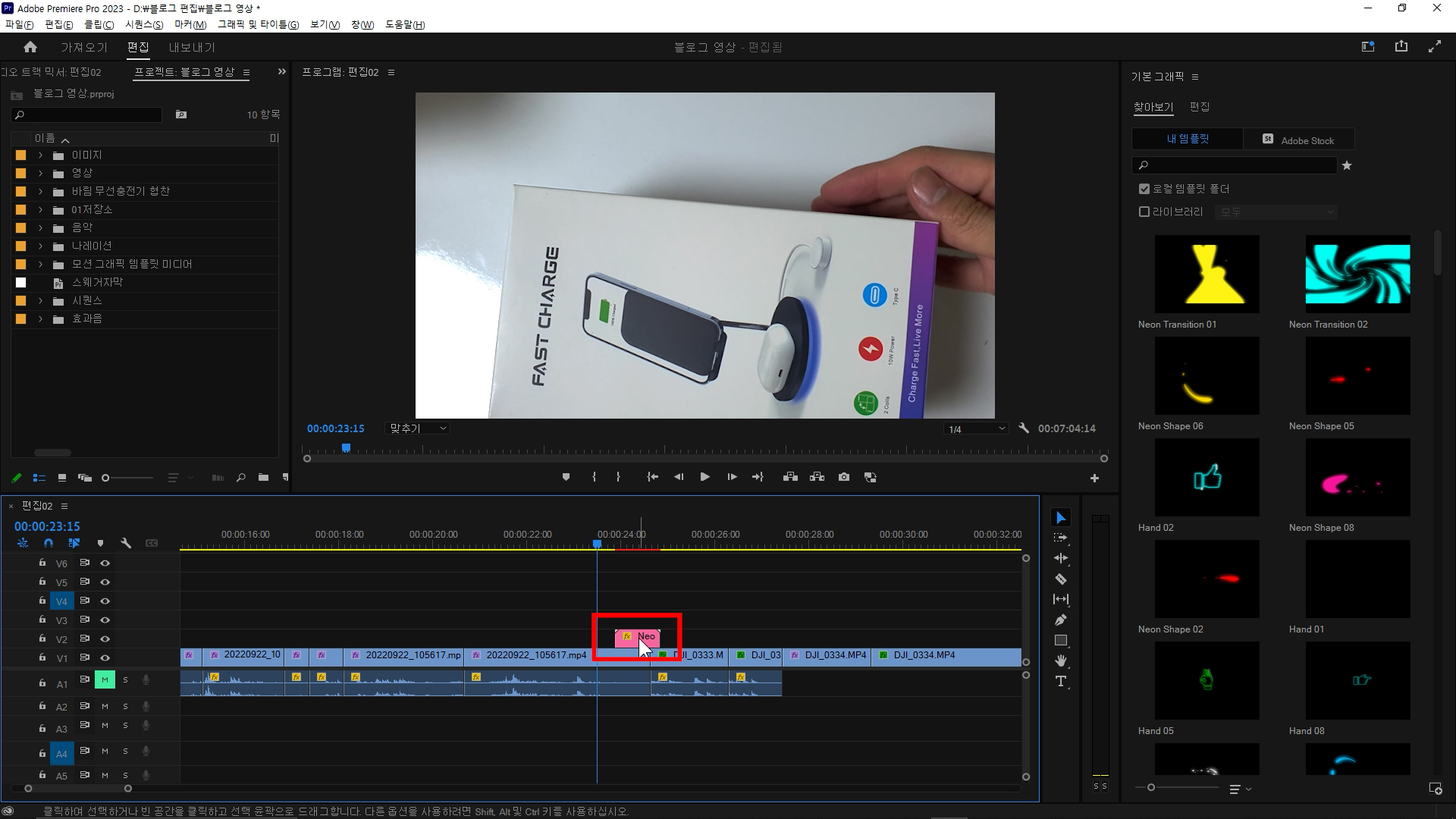 아래는 다운 받은 네온 효과 효과음을 사용해서 만든 영상입니다.
