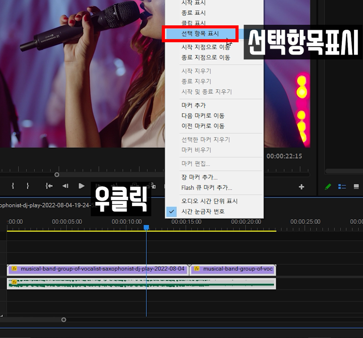 타임라인 위쪽에서 '우클릭 - 선택 항목 표시'를 누릅니다.