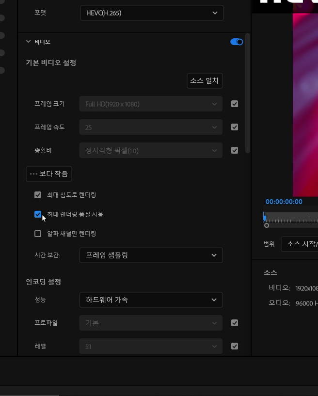 최대 심도로 렌더링, 최대 렌더링 품질 사용, 비트전송률 최대, 최고품질.