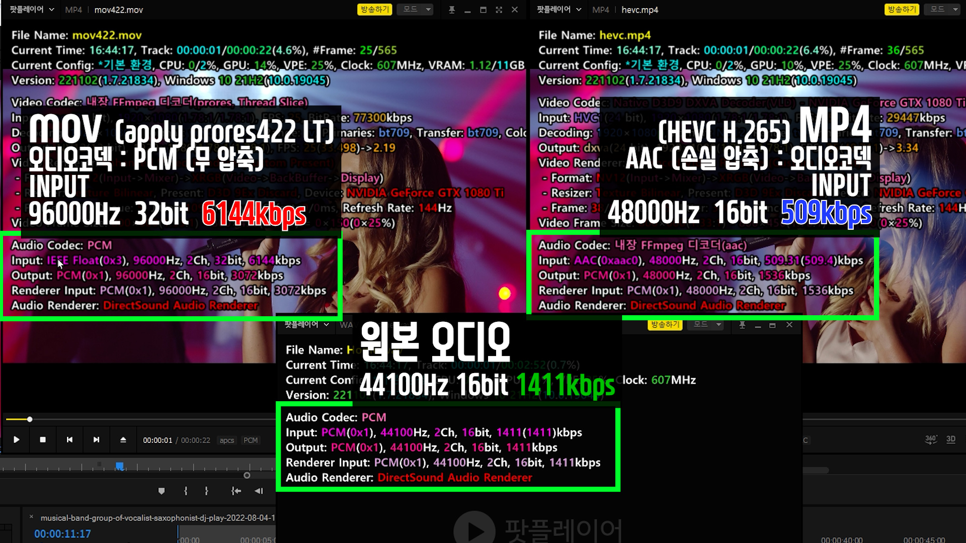 원본 오디오의 kbps값이 1411 kbps인데, mov(hevc h.265) 코덱으로 출력하면 원본의 값을 포함하는 높은 수치(6144kbps)로 인코딩 할 수 있습니다.