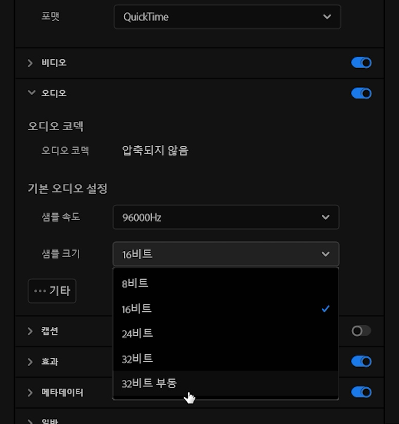 샘플 크기 : 32비트 혹은 자신의 오디오 파일에 맞는 수치를 선택합니다.