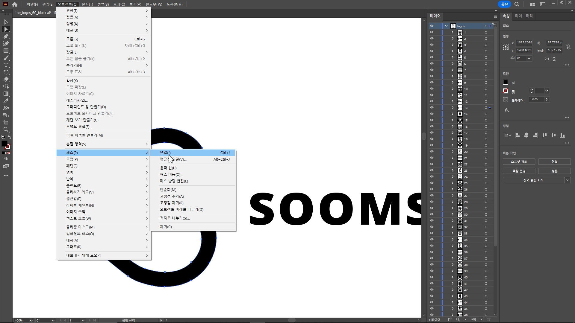 위 메뉴 - 오브젝트 - 패스 연결.