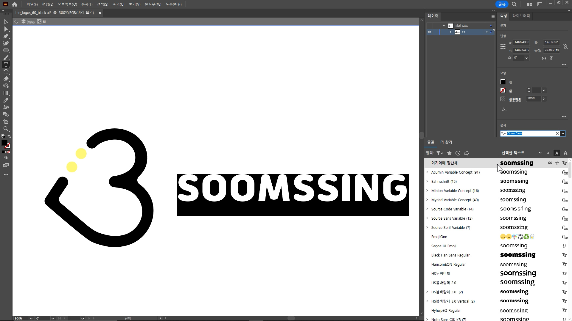 문자도구로 글자를 선택하고 폰트(서체)를 변경했어요.