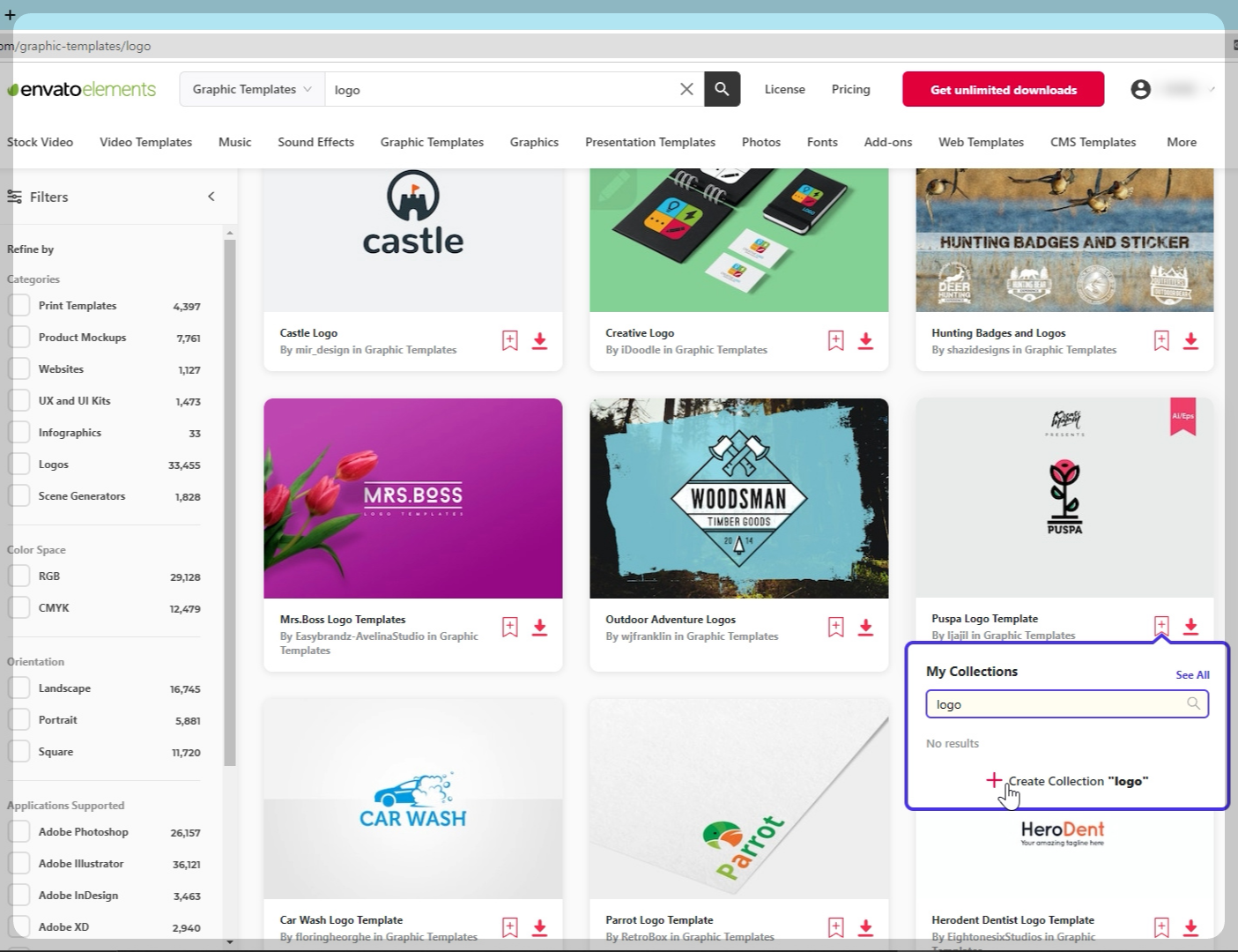 'logo' 콜렉션 페이지를 확인하면, 제가 모아 놓은 로고 그래픽 템플릿(logo graphic template)을 확인할 수 있습니다.