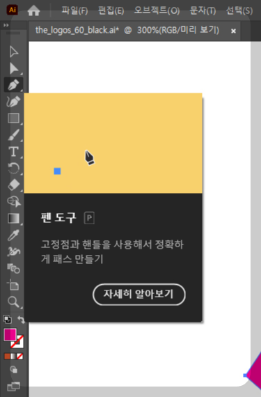 '직접 선택 도구, 펜도구, 곡률도구, 고정점도구(Direct Selection Tool, Pen Tool, Curvature Tool, Anchor Point Tool)'를 선택해서 사용하면서 익혀나가면 됩니다.