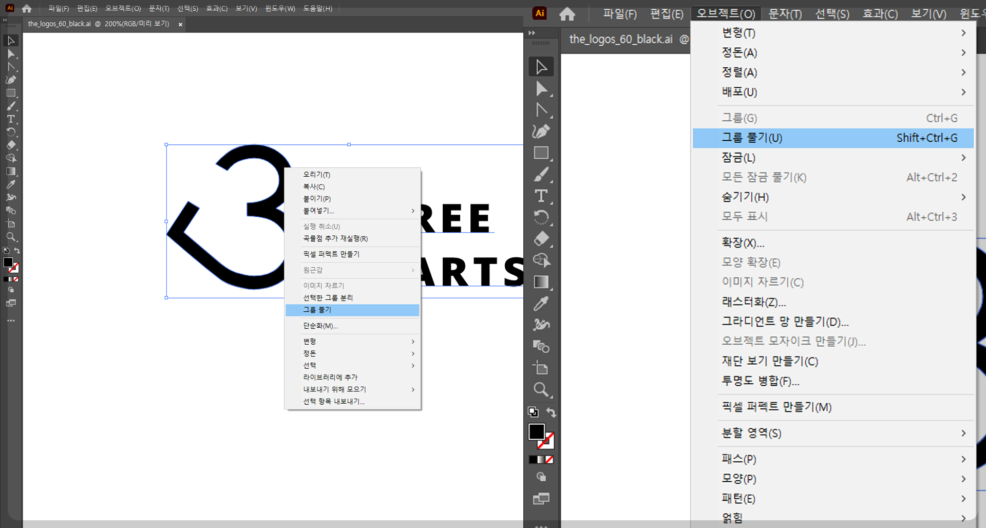또는 위 메뉴 - 오브젝트 - 그룹 풀기.