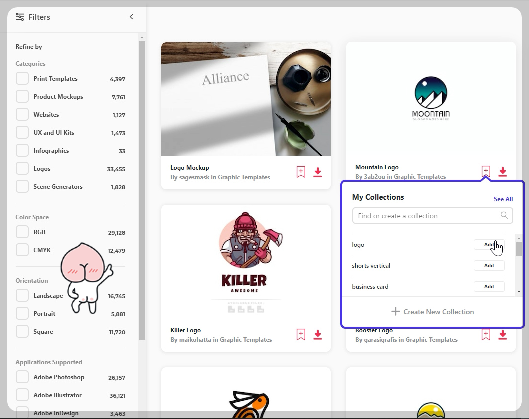 검색된 아이템들을 쭉 살펴보면서 플러스 버튼(+ 애드 투 컬렉션 Add to Collection)을 눌러서 마음에 드는 것들을 컬렉션에 모아줍시다.