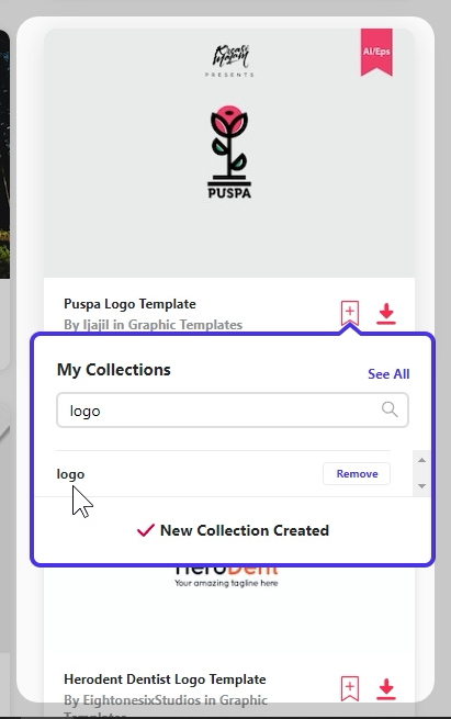 'logo' 컬렉션을 만들어 두었기 때문에 플러스 버튼을 누르고 'add' 버튼을 누르면 빠르게 컬렉션으로 모을 수 있습니다.