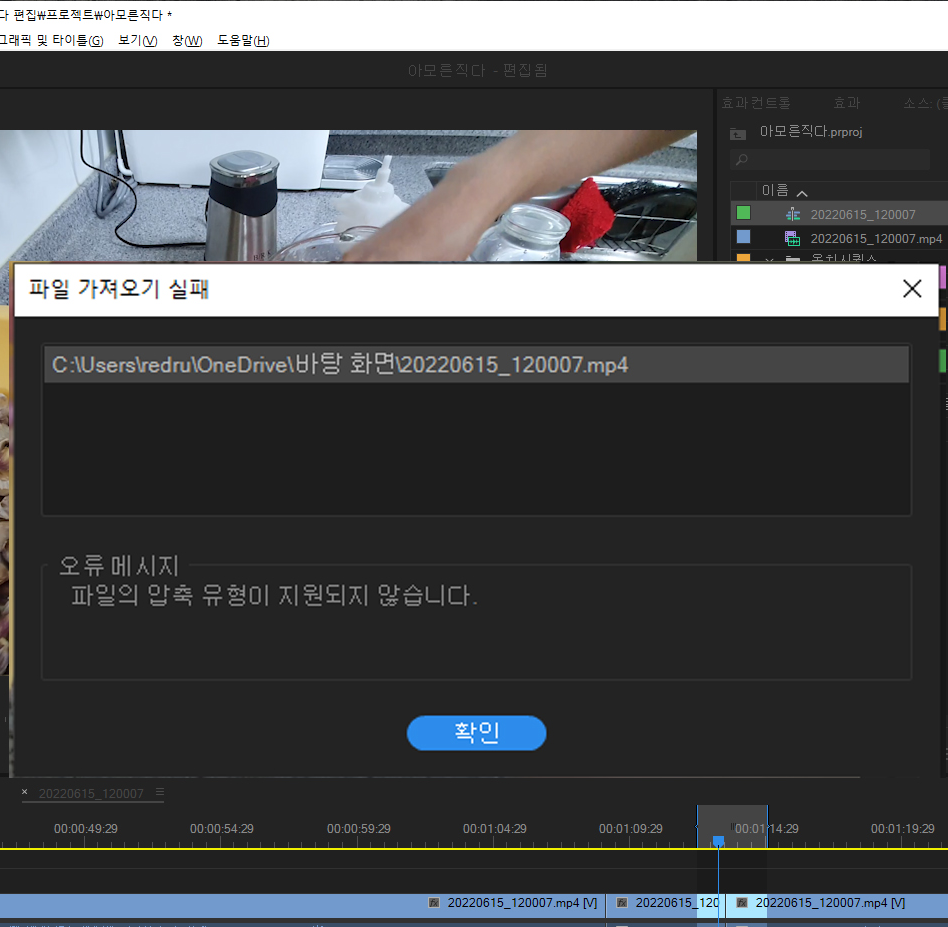 당연히 출력(익스포트 export)한 영상은 재생도 안되고, 프리미어로 가져오기도 안됩니다.