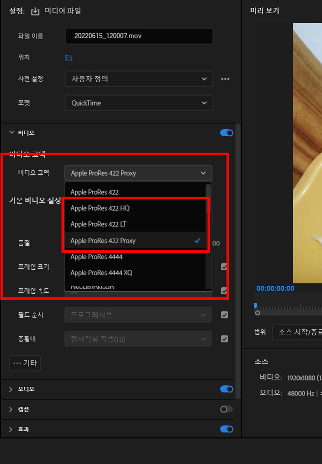 추천 : Apple ProRes 422 LT 또는 Apple ProRes 422 Porxy.