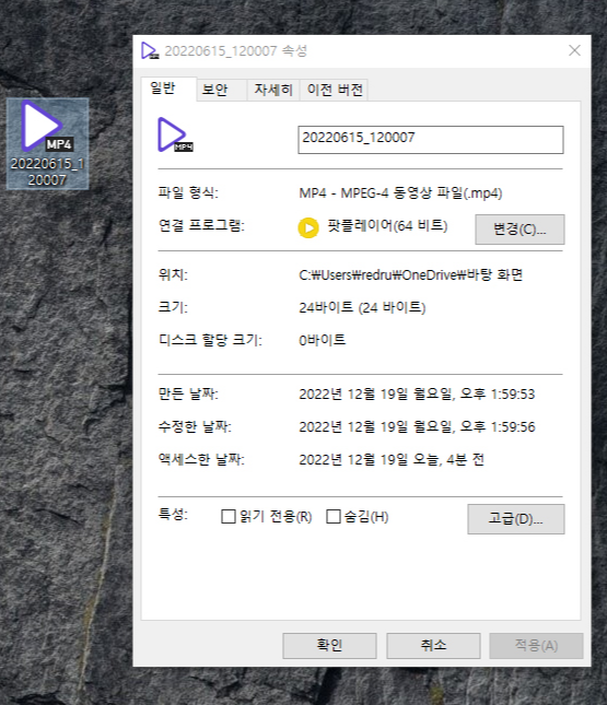 완성한 영상을 확인해보면, 용량이 24바이트 밖에 되지 않습니다.