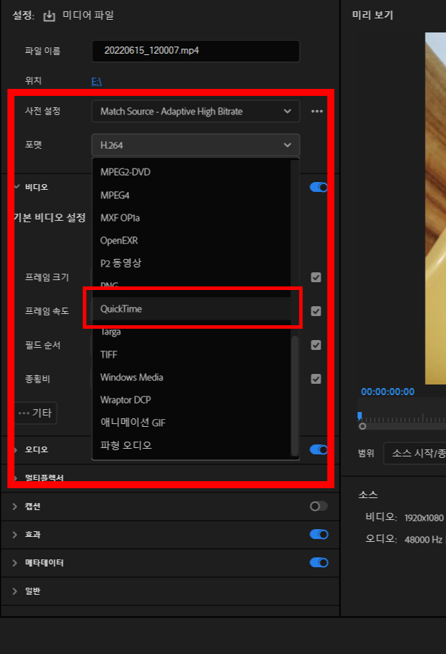 윈도우에서 고음질 영상 출력 추천 코덱, 프리미어 내보내기 exports
