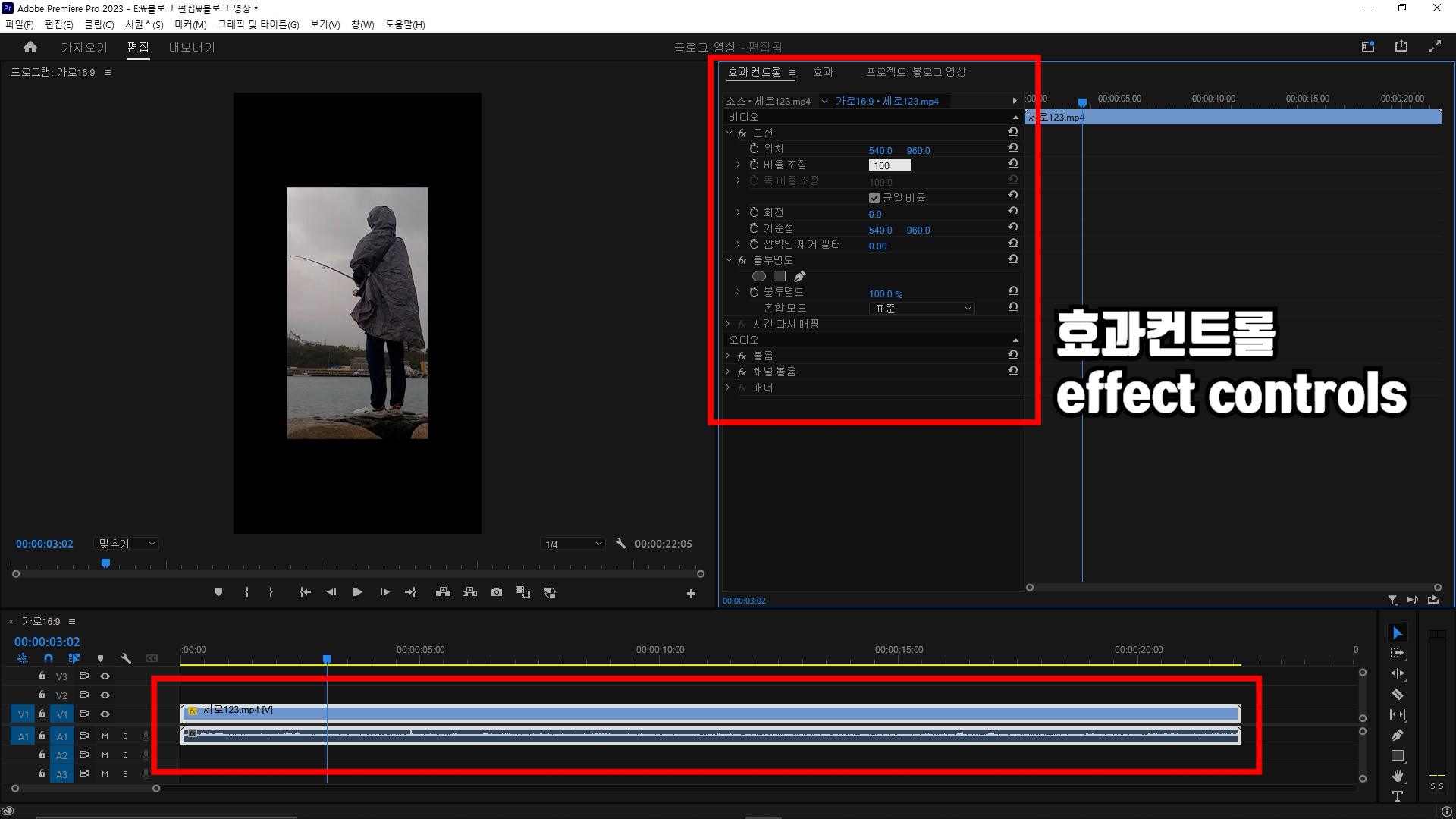 그리고 타임라인에서 클립을 선택하고, 효과컨트롤(effect control) 패널을 확인합니다.