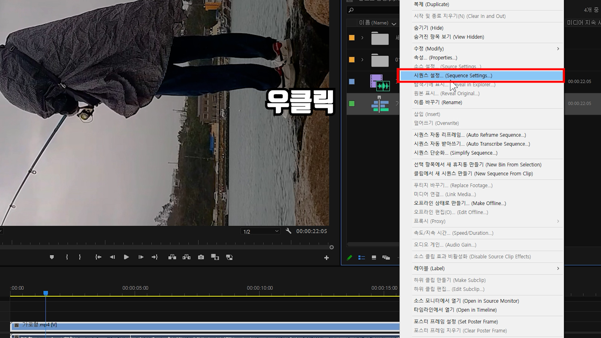 프로젝트 패널의 시퀀스 우클릭 - 시퀀스 설정.