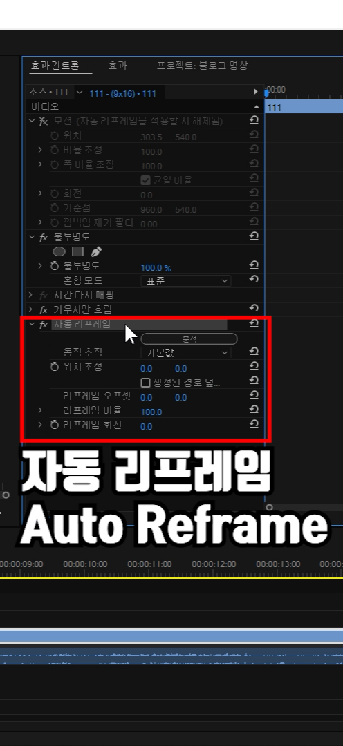 시퀀스 파일 우클릭 - 시퀀스 자동 리프레임.