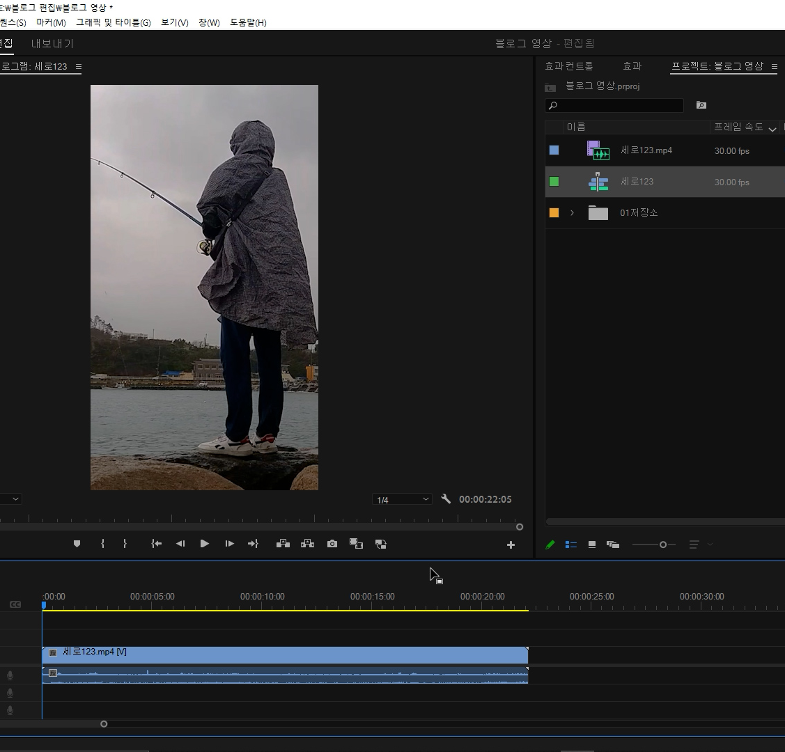 프로젝트 패널에서 세로 영상을 선택하고 비어있는 타임라인에 끌어서 옮깁니다.