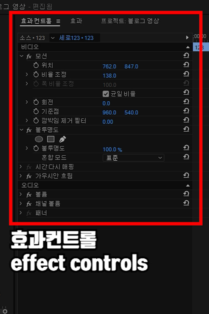 우선 자신의 프리미어에 효과 컨트롤(effect controls) 패널가 보이지 않는 경우.